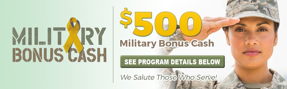 This special offer is for those who've risked their lives defending us. If you're Active, Active Reserved, Retired Military, Retired Military Reserve or are an honorably discharged veteran within 12 months of discharge date, you're eligible for up to $500 in Military bonus cash under our Military Incentive program. The offer applies to purchases and leases on new Chrysler, Jeep and vehicles.
